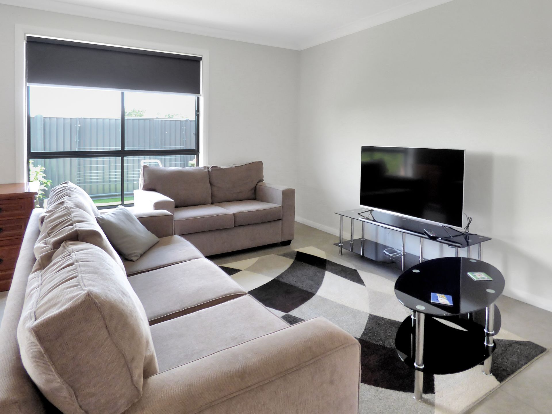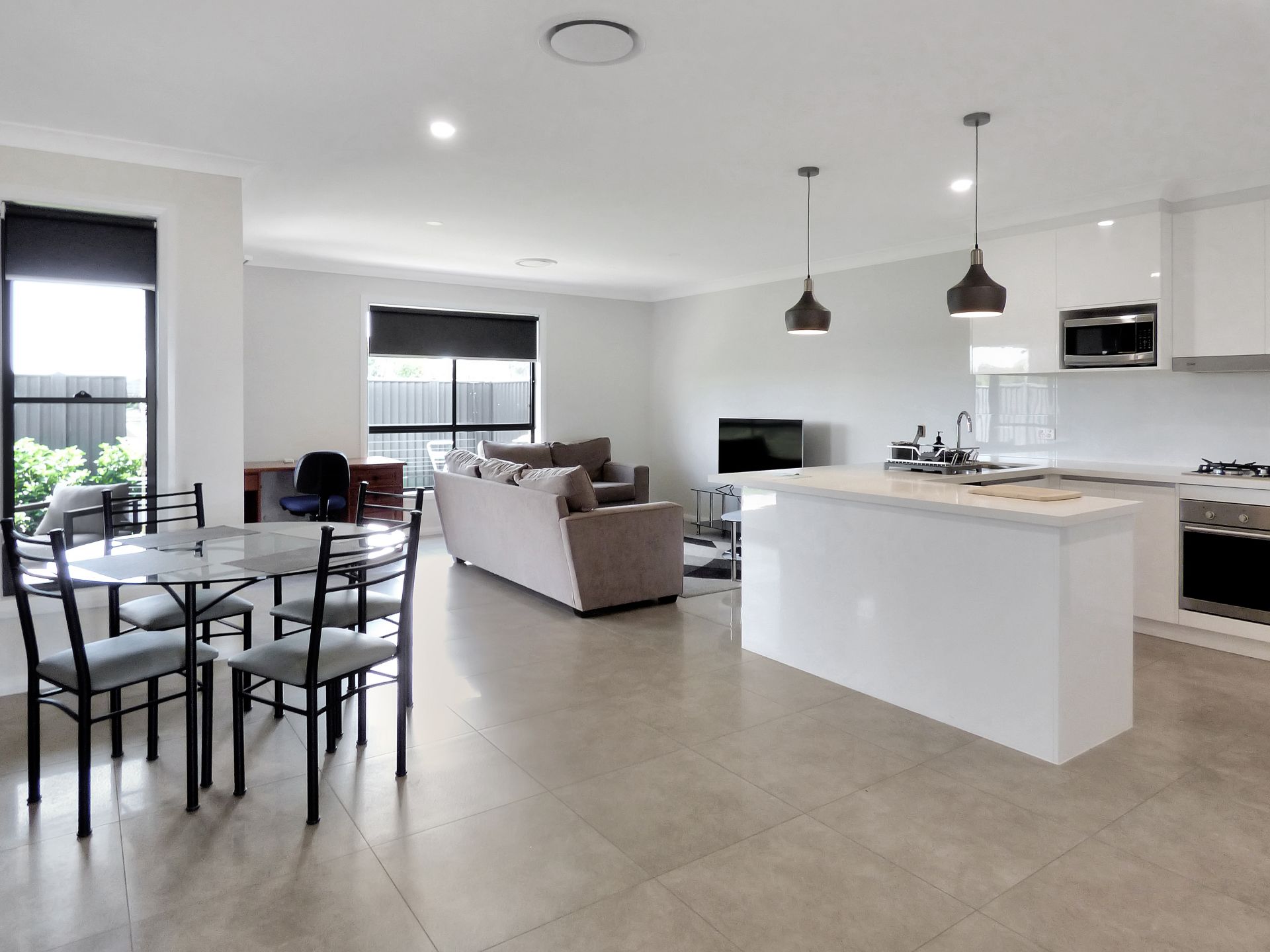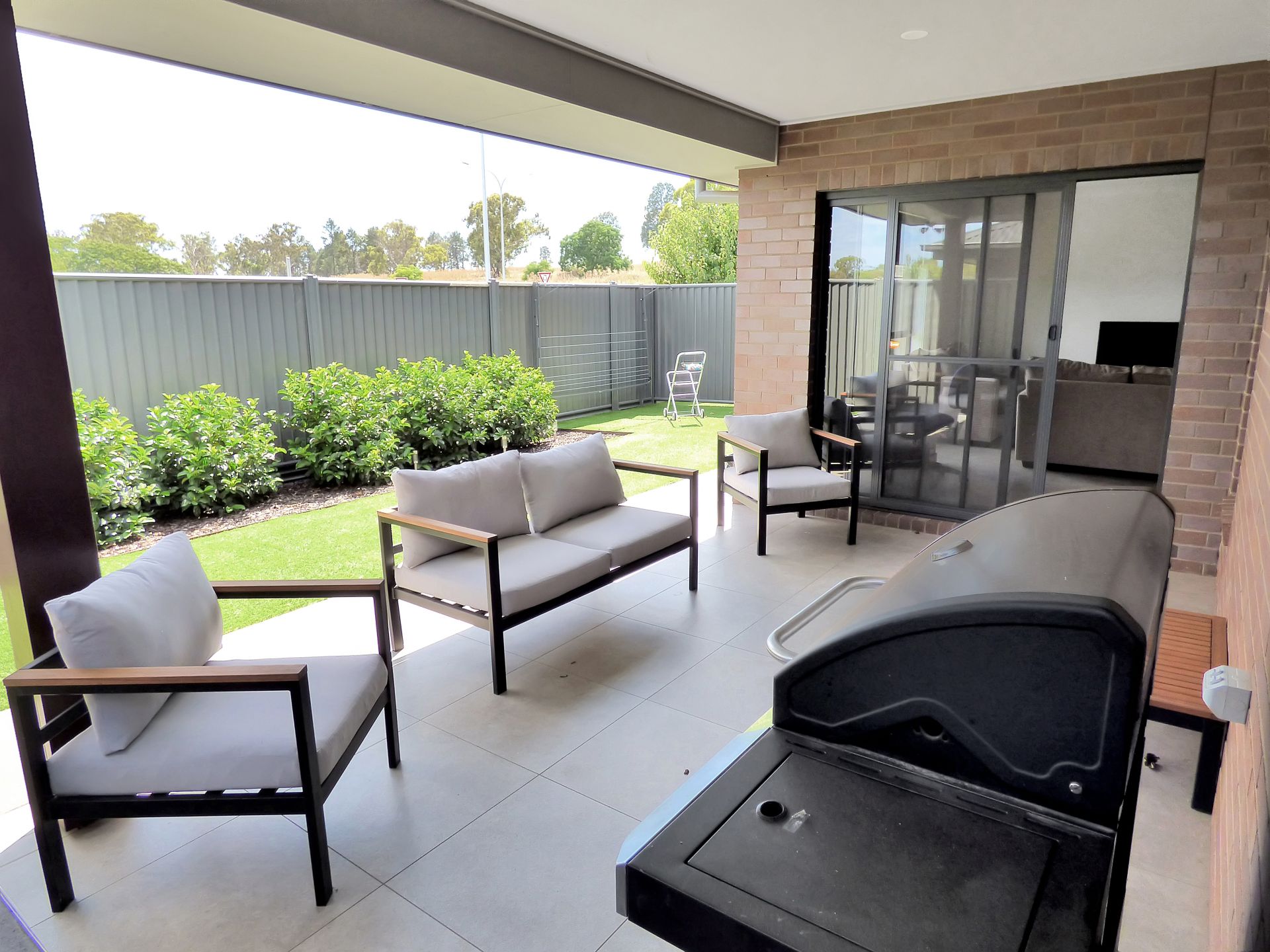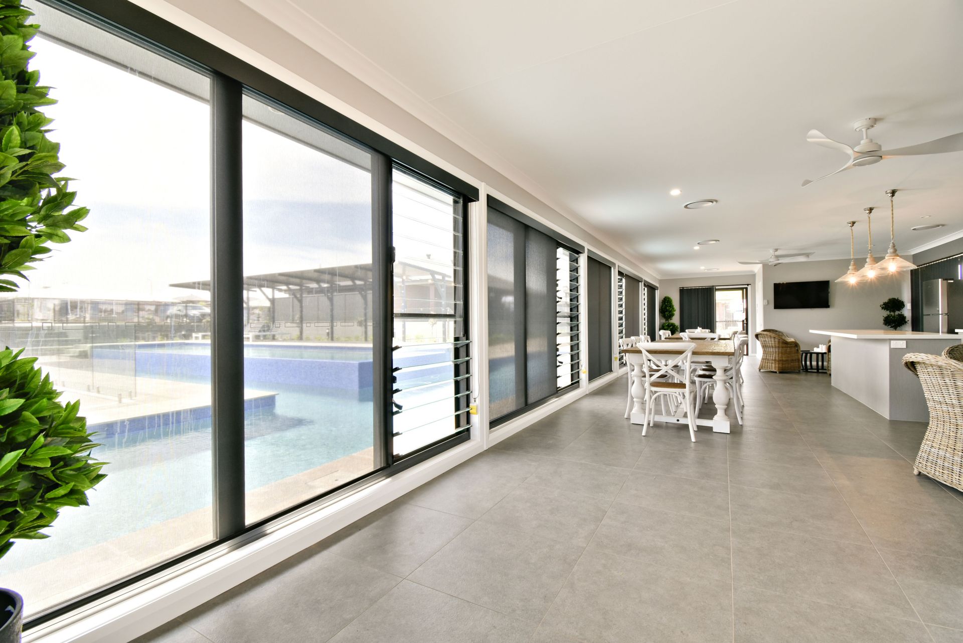 - Open plan living room with glass doors leading to outdoor patio entertaining area