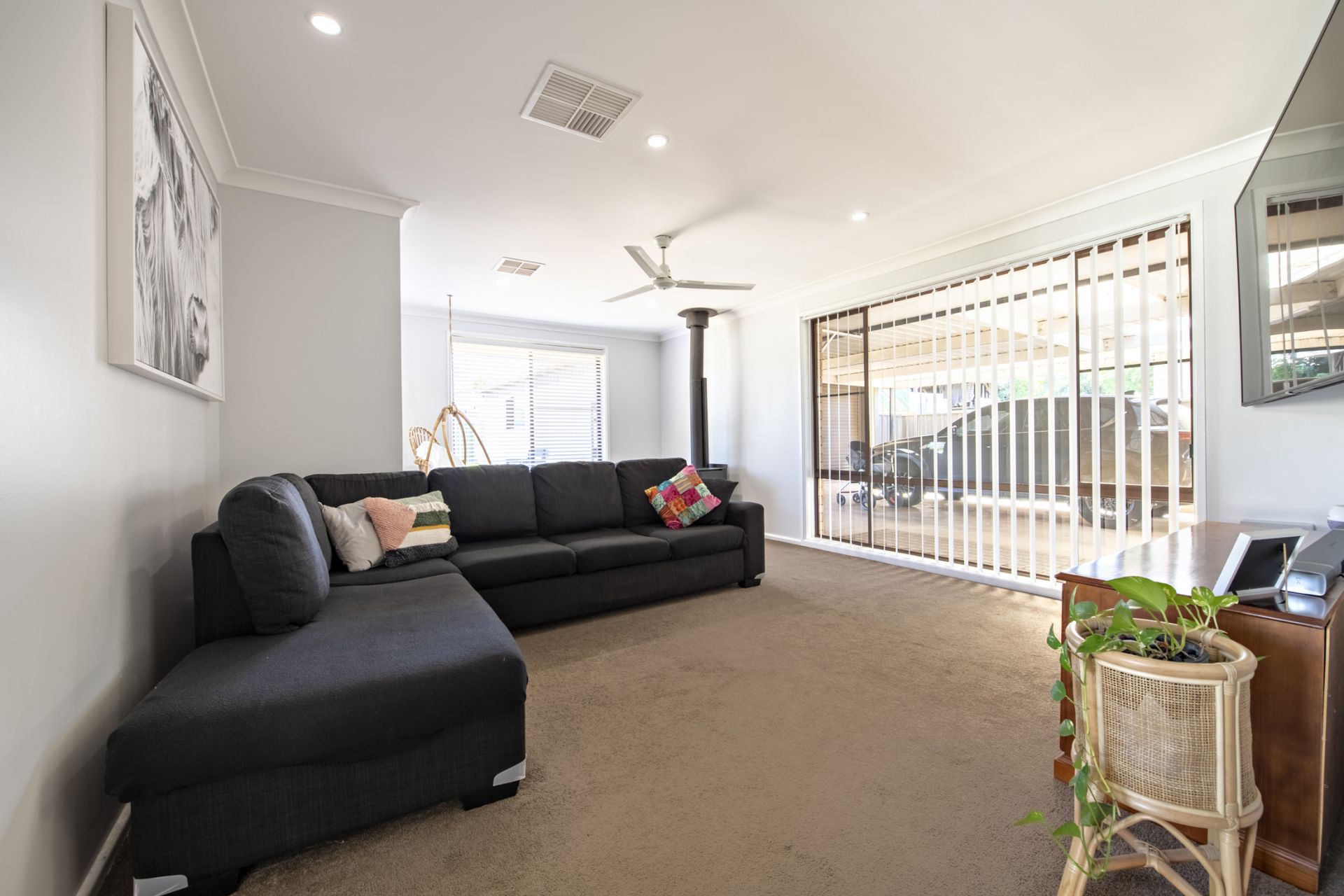 - Spacious living room with slow combustion wood heater