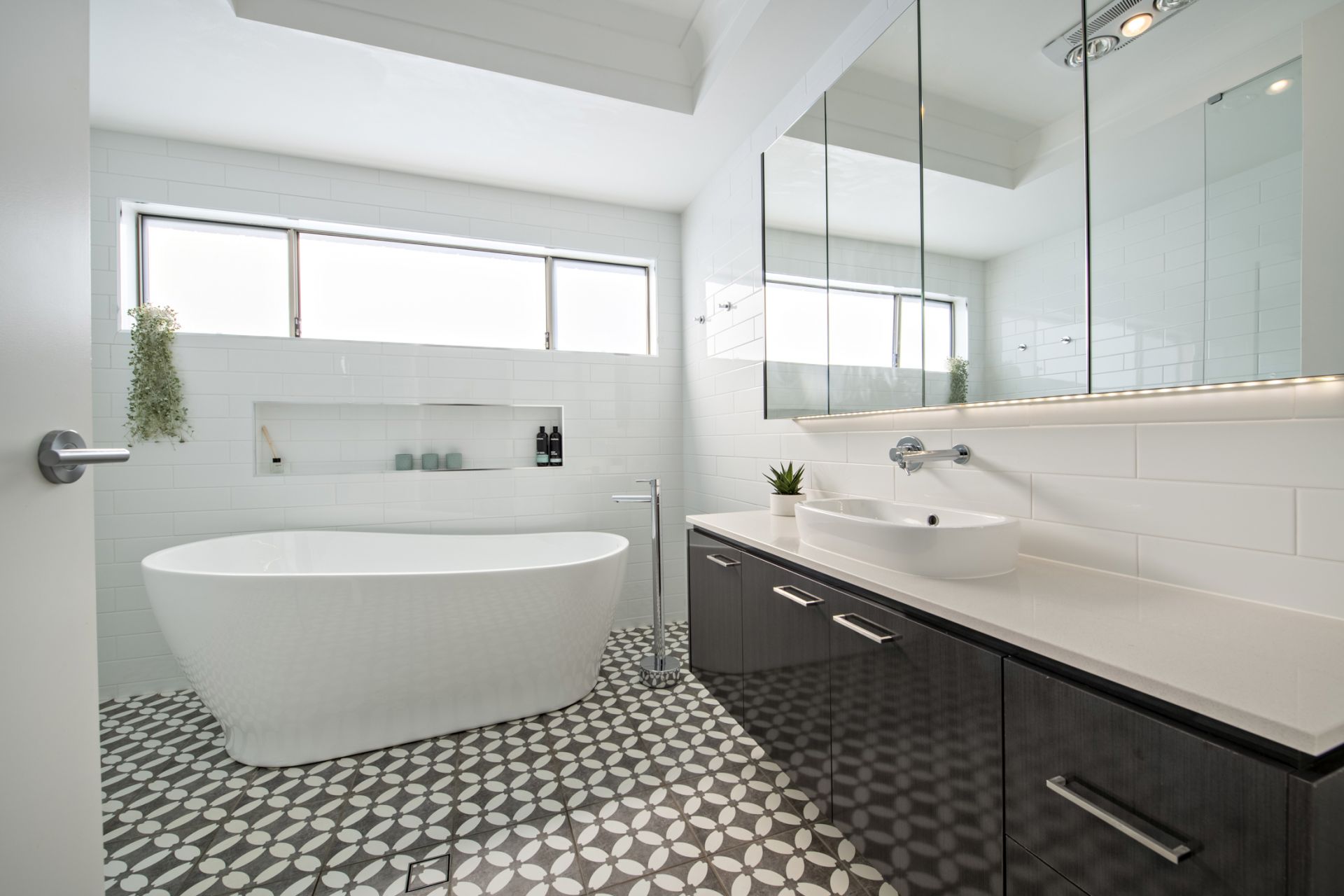 - Chic bathroom showcases egg shape bath & floor-to-ceiling tiles