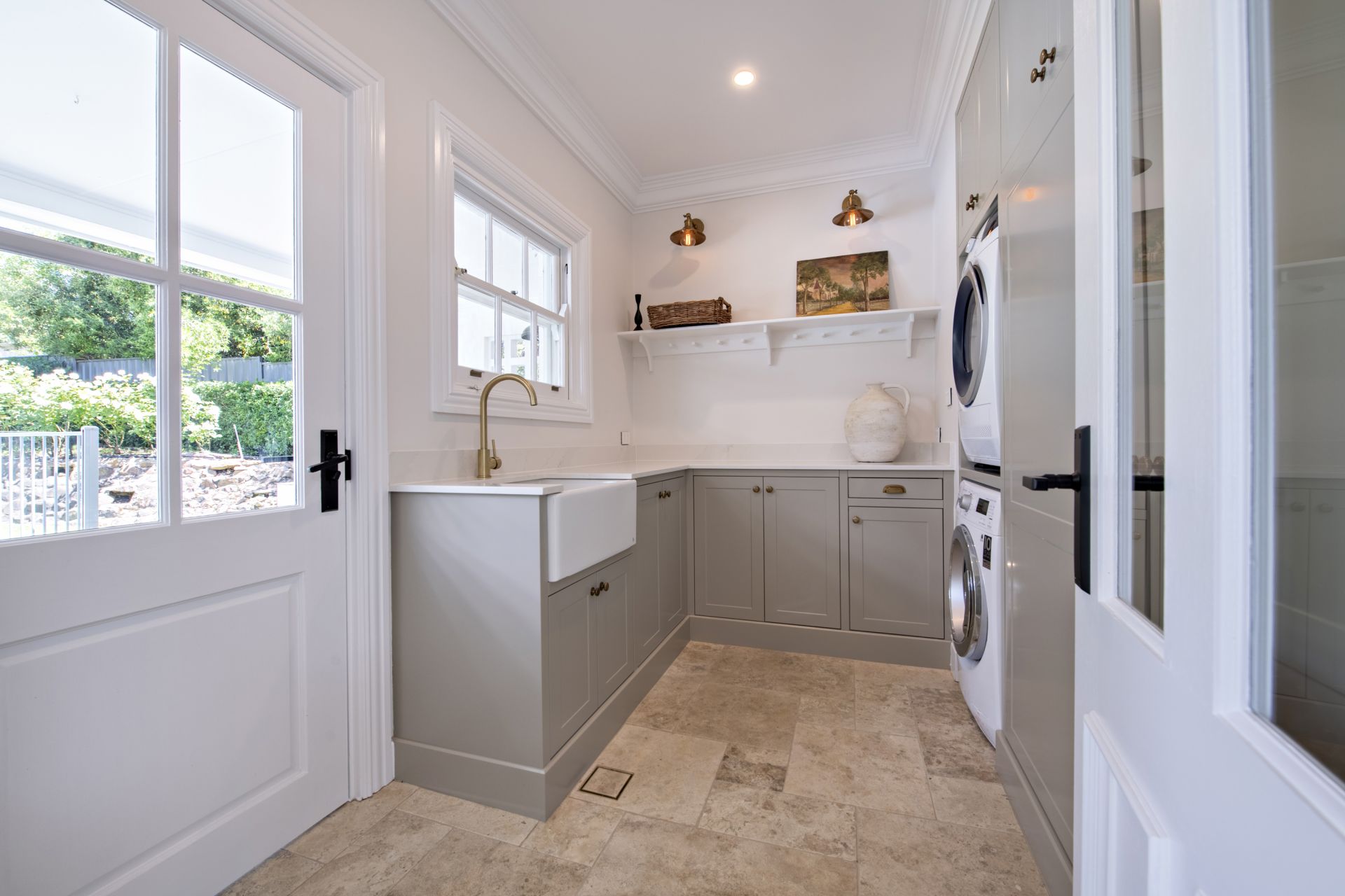 - Laundry with ample storage and stone benches