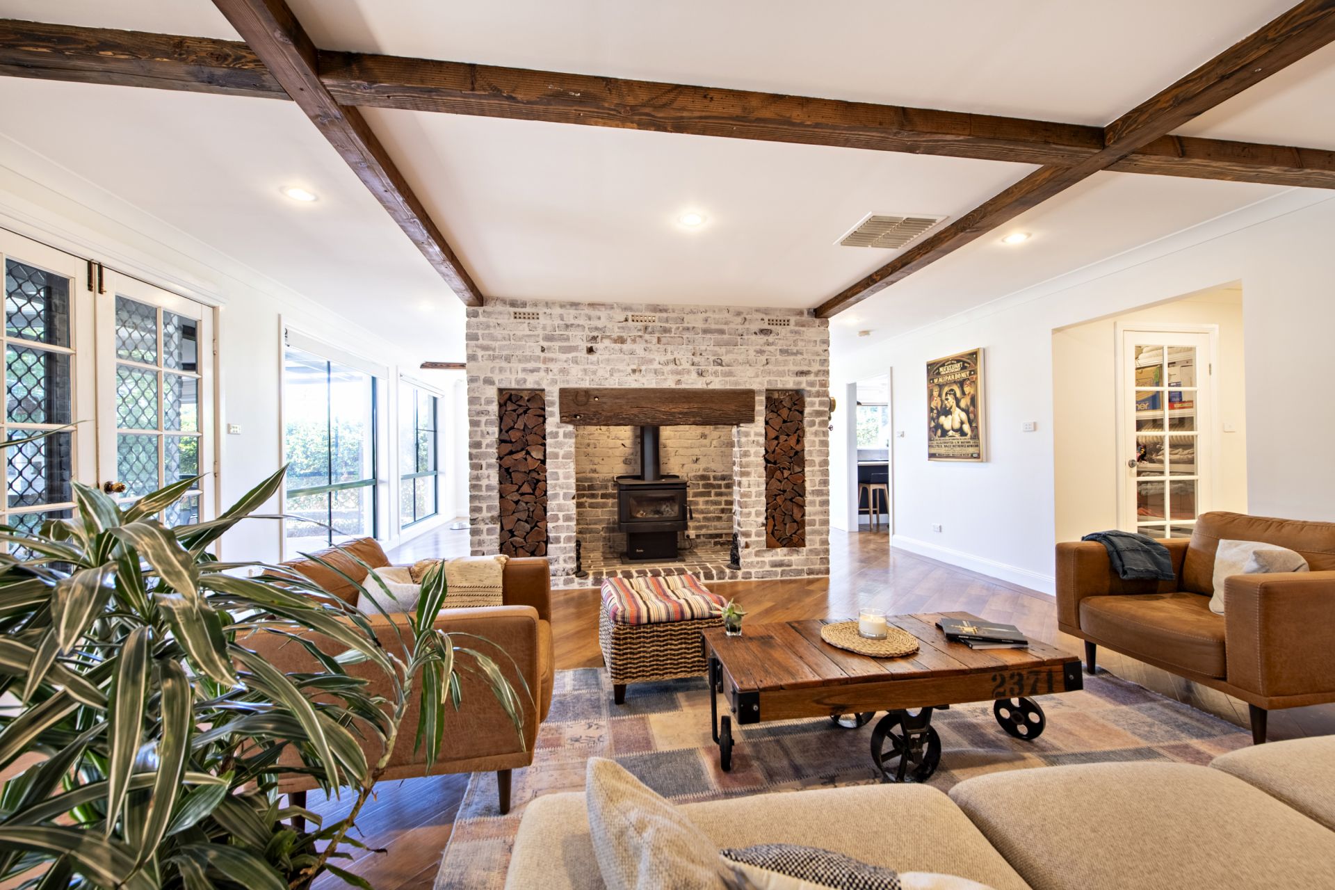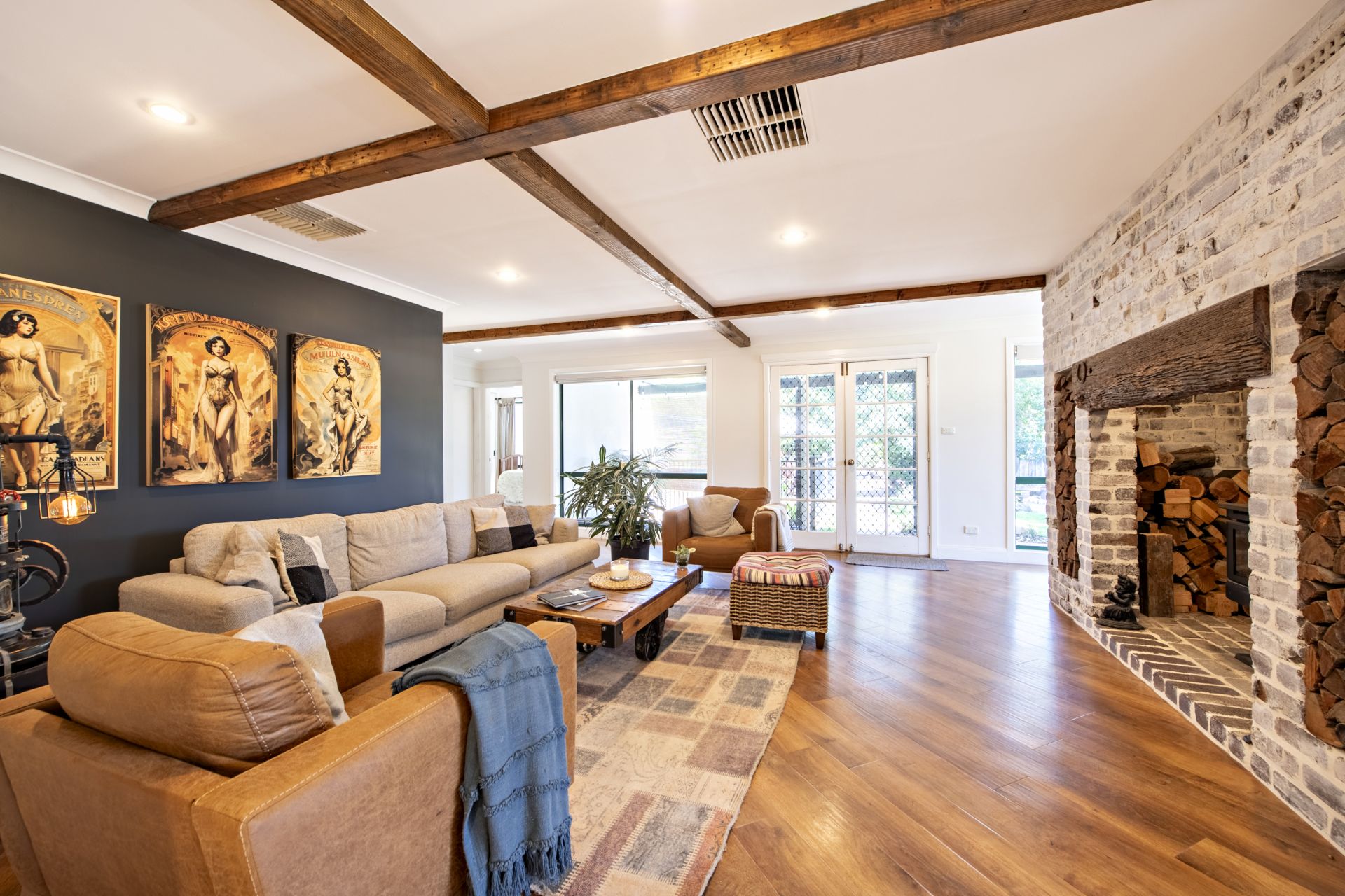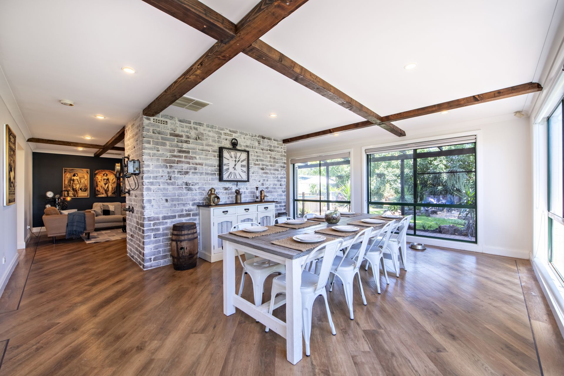 - Spacious family room with upcycled Oregan timber beams overlooks pool