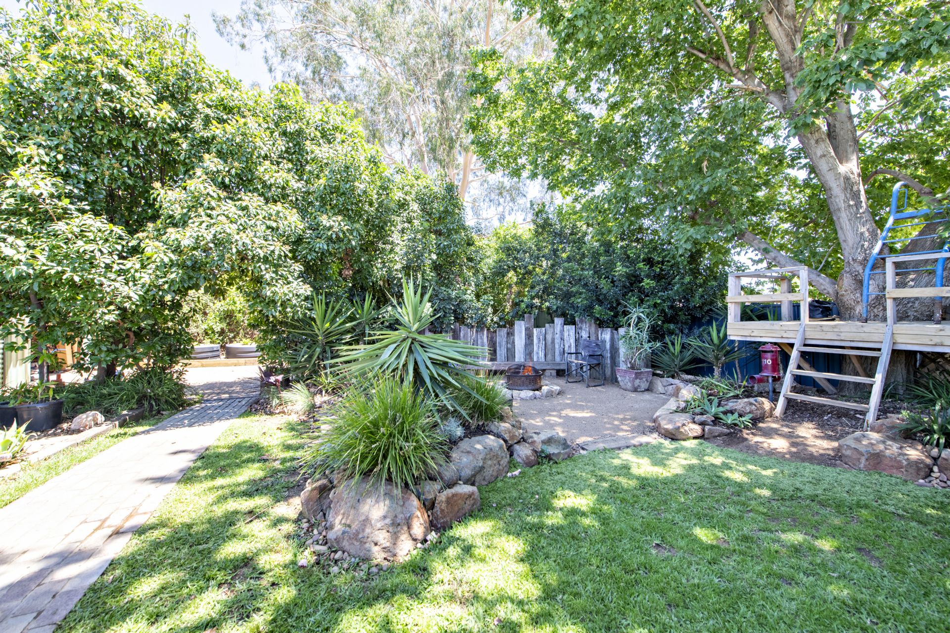 - Great family back yard with tree house, fire pit, vegie garden, established trees, and basketball ring
